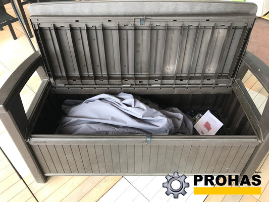Gartensitzbank mit großer Lehne und Staufach für Pakete